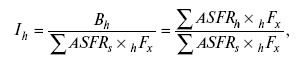 Индекс внебрачной рождаемости (Ih) равен отношению наблюдаемого числа рождений вне брака к ожидаемому при условии, что реальное население имеет повозрастные показатели внебрачной рождаемости, равные стандарту естественной рождаемости: