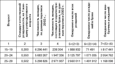 Относительно внебрачной рождаемости и рождаемости в возрастах моложе 20 лет и старше 49 лет, Борисов полагал, что «наиболее верным представляется оставить фактическое число неизменным (т. е. считать, что число родившихся вне брака и у матерей моложе 20 лет и старше 49 лет в условиях естественной рождаемости было бы таким же, каким оно и есть фактически)»[360]360