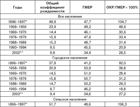Общие коэффициенты рождаемости (ОКР), гипотетический минимум естественной рождаемости (ГМЕР) и степень реализации ГМЕР в России[364]364