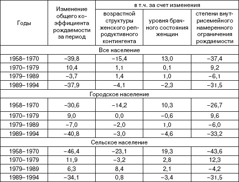 В таблице 6.12 приведены данные, характеризующие роль каждого из перечисленных выше факторов в динамике общего коэффициента рождаемости в России во второй половине XX в. Данные таблицы ярко характеризуют решающую роль репродуктивного поведения в динамике общего коэффициента рождаемости в данный период.