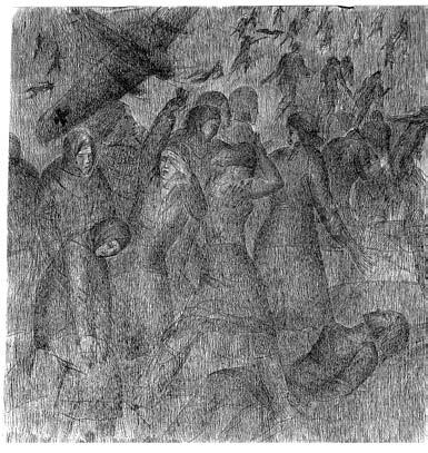 «…и вдруг она отчаянно вцепилась когтями в парик и вместе со своим трофеем моментально была вознесена на чердак. А вокруг голого черепа мистера Доббинса неожиданно распространилось сияние, так как сын живописца позолотил ему лысину».