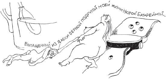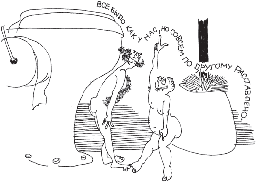 Воспоминания о жизни за щитком начались с описания мармеладных кусочков. Я был несколько слаб после контузии, вследствие чего вскоре после первого же упоминания о мармеладе отключился, а отключившись, имел видение: будто иду по какой-то незнакомой местности, явно за щитком, среди экзотических объедков и неописуемой шелухи, причем иду не с Нюрой, а с какой-то очень соблазнительной тараканихой средних лет. Тараканиха выводит меня на край кухонного стола и, указывая вниз, на пол, густо усеянный крошками, говорит с акцентом: “Дорогой, все это – твое!” И мы летим с нею вниз.