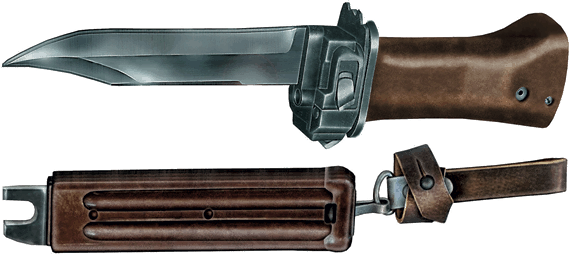 В случае необходимости вместо клинка в рукоятку можно вставить пилу с крупными зубьями, предназначенную для резки дерева и предметов из неметаллических материалов. В комплект входит также топор с полукруглым лезвием, а в сумке для переноски имеется место для шила и других принадлежностей, необходимых для длительных действий в тылу противника.