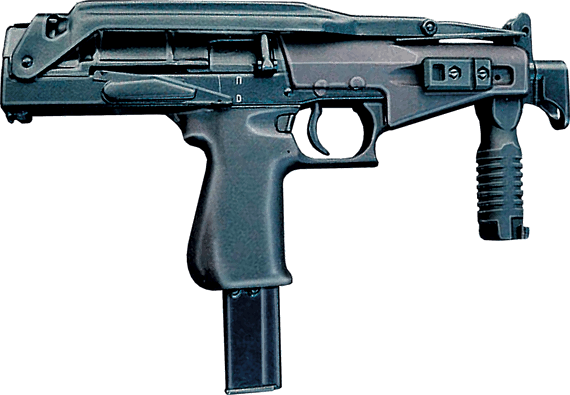 Одновременно разворачиваются складные пистолетная рукоятка со вставленным магазином емкостью 20 патронов и скоба со спусковым крючком. На это требуется около 3–4 секунд и еще одна секунда необходима для снятия оружия с предохранителя и взведения затвора: пистолет-пулемет готов к бою.