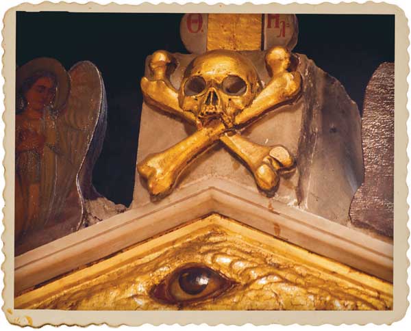 Двадцать пять лет не был Акис в церкви. Он минует пулю в стене и входит внутрь. Дверь за ним захлопывается. В церкви очень торжественно; ее стены снизу доверху увешаны темными иконами. Он идет по проходу, останавливается перед алтарем, поднимает голову к кресту. Основание креста опирается на золотой череп с двумя скрещенными костями. Пустые глазницы, кажется, смотрят на Акиса, и он не может отвести от них глаз.