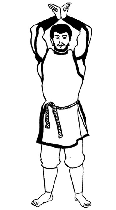 Встаньте на пол, выпрямите спину, пятки соедините, носки разведите в стороны. Сделайте глубокий вдох. Поднимите руки над головой, согните их в локтях и, скрещивая, заведите за голову. Помощник, стоящий сзади, должен обхватить ладонями ваши запястья или предплечья, плавно тянуть ваши руки немного в стороны и вниз. Во время потягиваний делайте глубокий вдох.