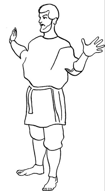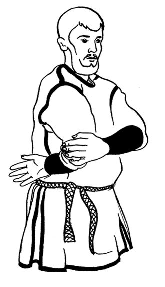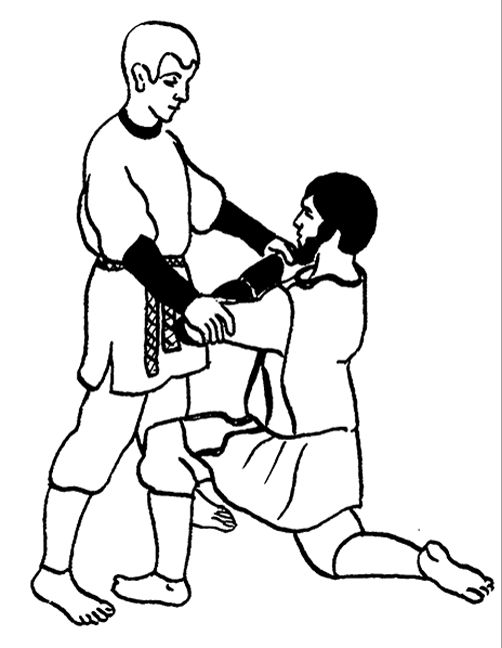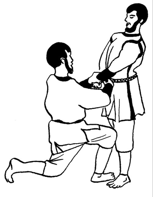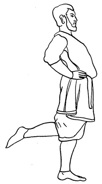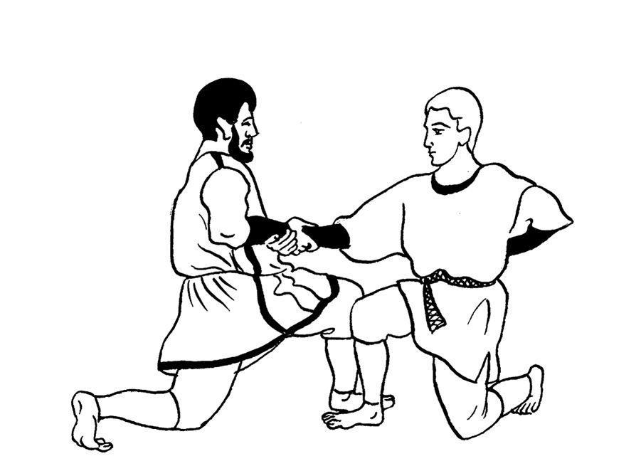 Встаньте с помощником лицом друг к другу и опуститесь на одно колено. Упритесь коленями друг в друга. Одну руку поставьте на пояс или заведите за спину, вытянув предплечье вдоль поясницы. Вторую руку протяните к помощнику. Он должен проделать то же самое. Ухватите ладонями предплечья друг друга.