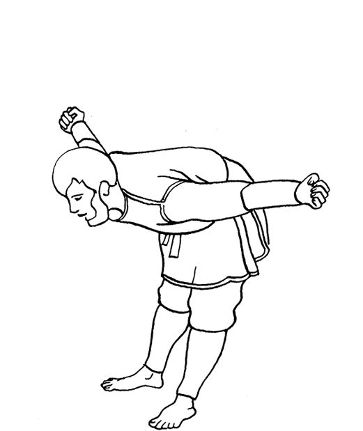 Встаньте на пол, выпрямите спину, пятки соедините, носки разведите в стороны. Сделайте глубокий вдох. Отведите руки назад и соедините ладони за спиной в замок. Выдыхая, наклоняйте корпус вперед, поднимая руки. Старайтесь наклониться как можно ниже. При этом расслабьте мышцы рук и плечевого пояса, двигая руки как можно дальше вперед. Плавно вернитесь в исходное положение.