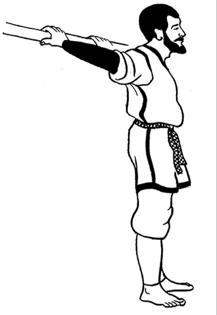 Выпрямив локти, опустите руки вперед и оставьте их втянутыми параллельно полу. Переходите к следующему движению.