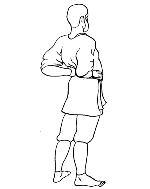 Встаньте на пол, выпрямите спину. Ноги на ширине плеч. Сделайте глубокий вдох. Согните правую руку в локте и прижмите тыльной стороной кисти к боку на уровне почек. Локоть смотрит в сторону, ладонь – наружу.