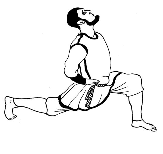 Встаньте на пол, выпрямите спину, ноги поставьте на ширине плеч. Сделайте правой ногой широкий шаг вперед и присядьте на нее, левую ногу максимально отведите назад. Плавно прогните спину и опустите корпус вниз. Правую руку заведите под правое колено и обхватите ладонью щиколотку. Левой рукой, согнутой в локте, опирайтесь на пол.