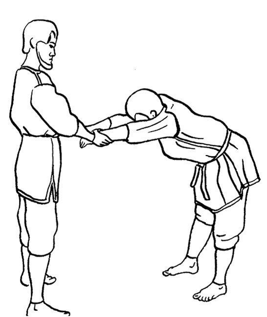 Встаньте на пол, выпрямите спину, ноги поставьте на ширине плеч. Помощник стоит лицом к вам в такой же позе. Наклонитесь вперед, опустив руки вниз. Помощник должен крепко обхватить своими ладонями ваши запястья.