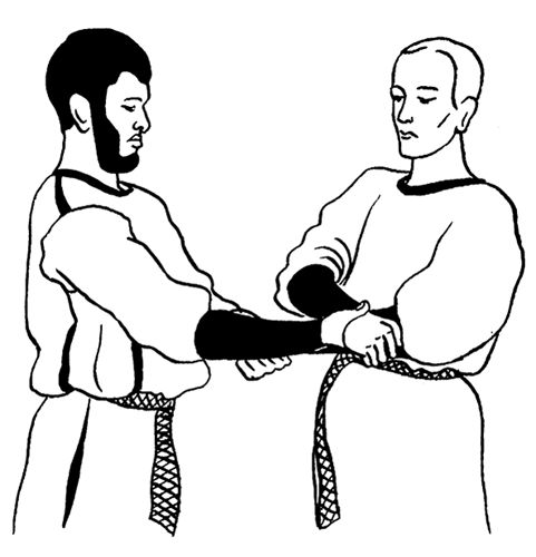 Встаньте на пол, выпрямите спину, ноги поставьте на ширине плеч. Помощник стоит лицом к вам в такой же позе. Согните руки в локтях перед собой и скрестите их в предплечьях.