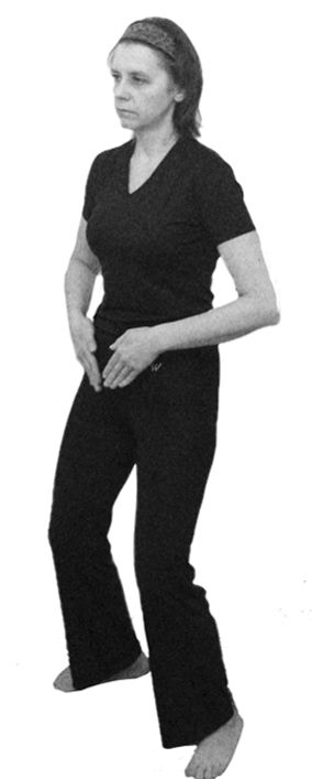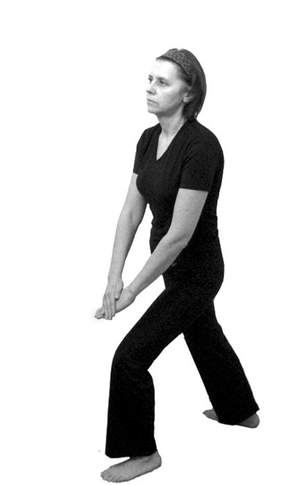 Исходное положение: стоя в полуприседе (поза всадника), ноги на ширине плеч. Спина прямая. Грудь немного втянуть. Руки находятся на нижней части живота. Взгляд направить прямо перед собой.