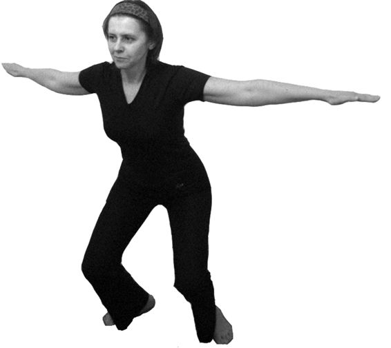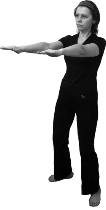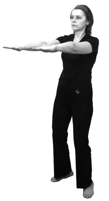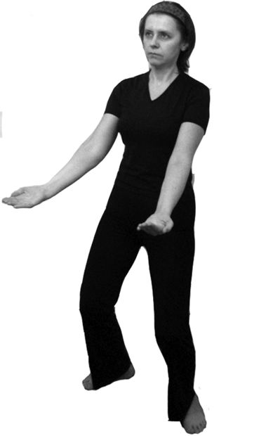 Исходное положение: стоя в полуприседе (поза всадника), ноги на ширине плеч. Спина прямая. Грудь немного втянуть. Руки развернуты в стороны и выпрямлены, ладони обращены вниз. Взгляд направить прямо перед собой (рис. 6.28).