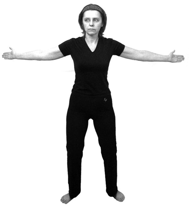 2. Встаем, не меняя положения раскинутых рук – они поднимаются вместе с телом. Одновременно делается выдох.
