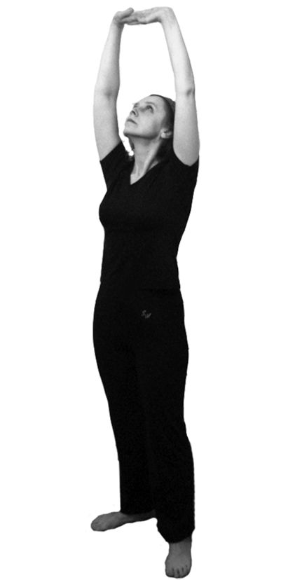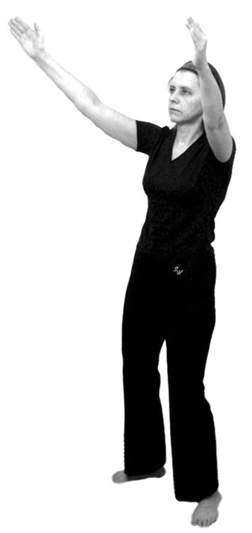 1. Руки постепенно поднимаем до уровня груди, потом до макушки (рис. 6.5), потом тянем вверх, раскрываем ладони. Колени одновременно полностью распрямляются. Во время этого движения делается вдох и не прерывается, а длится и на следующем движении!