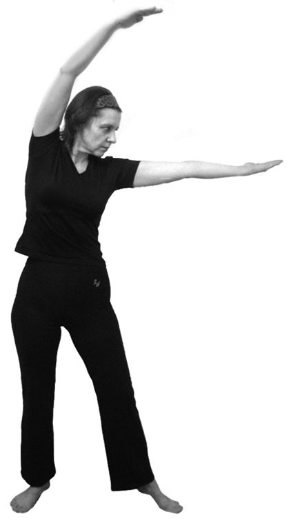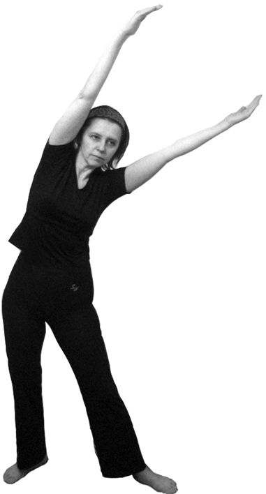 2. Центр тяжести тела переносим на правую ногу, немного сгибаем ее в колене. А левую ногу вытягиваем носком вперед (носок упирается в пол, пятка оторвана от земли). Делаем наклон влево – левая рука прямая и постепенно оказывается в горизонтальном положении. Правая рука во время наклона описывает над головой полукруг. Вдох продолжается и во время этого движения (рис. 6.6).