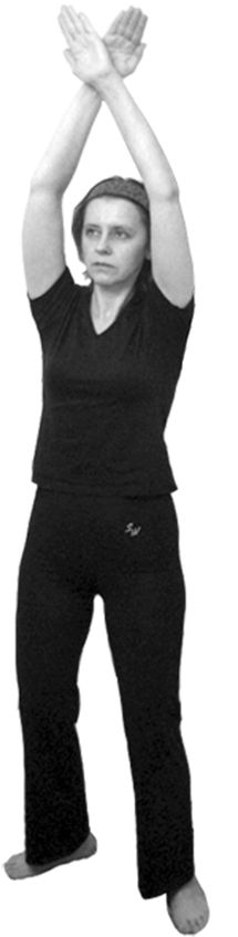 Исходное положение: стоя, ноги на ширине плеч. Спина прямая. Взгляд направлен вперед. Руки – согнуты в локтях, сплетены в ладонях высоко перед грудью (рис. 6.34).
