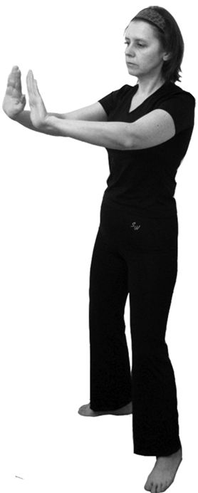 Исходное положение: стоя в полуприседе (поза всадника), ноги на ширине плеч. Спина прямая. Грудь немного втянуть. Руки на уровне поясницы, ладони обращены вверх. Взгляд направить прямо перед собой (рис. 6.26).