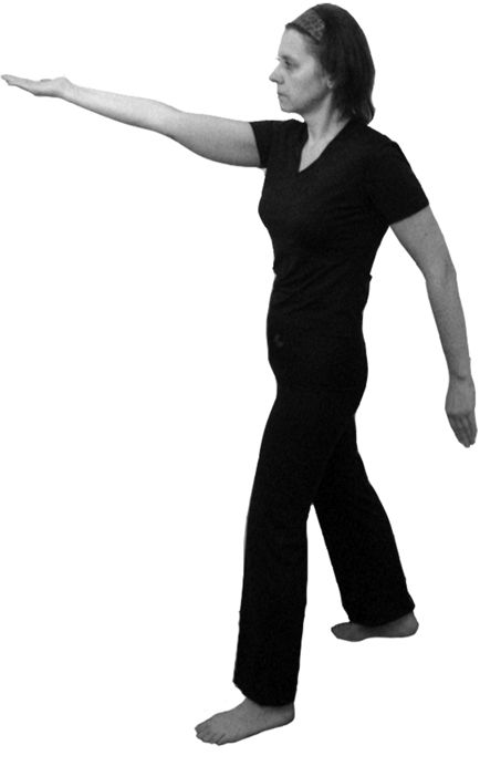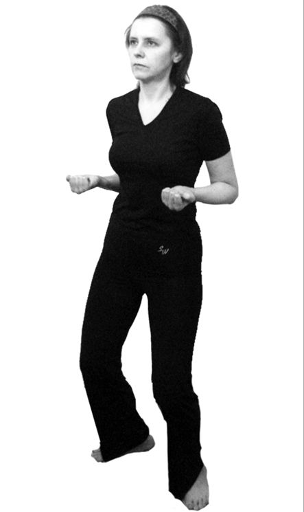 3. На счет «три» то же движение на вдохе выполняется с правой ноги: полшага вперед и вправо. Туловище немного наклоняется вперед. Центр тяжести тела перемещается на правый носок. Пятка левой ноги отрывается от пола.