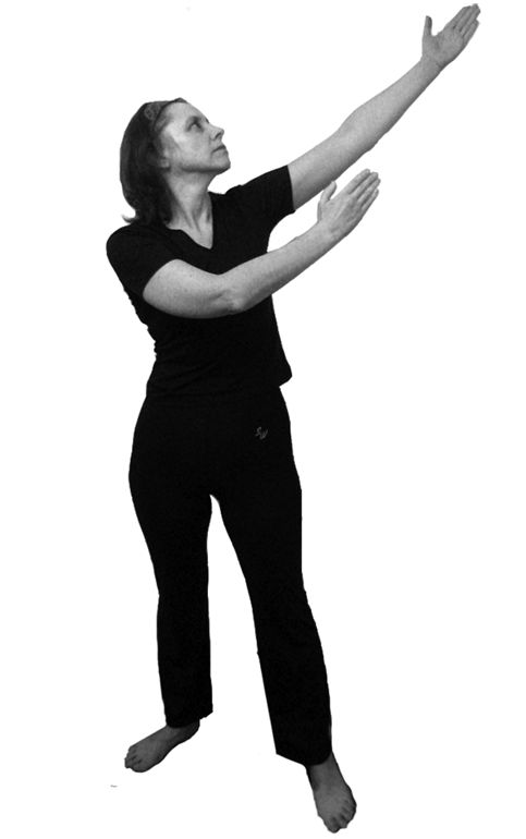 3. Повторяем движение, выполненное на счет «раз»: обе ладони выворачиваем наружу и перед собой поднимаем руки – высоко над головой; голова задирается, взгляд устремлен вверх.