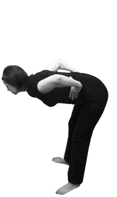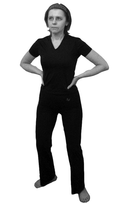 Исходное положение: стоя, ноги на ширине плеч. Спина прямая. Взгляд направлен вперед. Руками обхватить поясницу.
