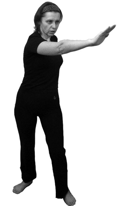 1. Принимаем позу всадника – немного сгибаем ноги, разведенные на ширину плеч, в коленях. Правая рука выдвинута вперед, ладонь обращена влево. Левая рука внизу на уровне пупка (рис. 6.20). Делаем вдох.