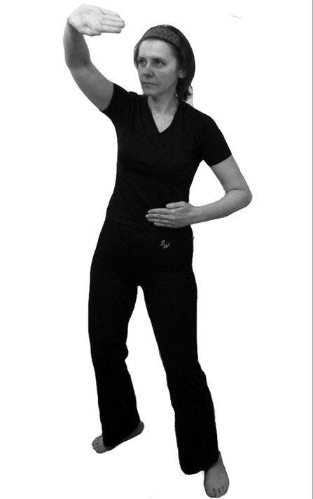 3. Центр тяжести тела переносим на левую ногу, немного сгибаем ее в колене. Правую ногу вытягиваем носком вперед (носок упирается в пол, пятка оторвана от земли). Делаем наклон вправо – правая рука прямая. Левая рука при наклоне описывает над головой полукруг. Во время этого движения делается выдох.