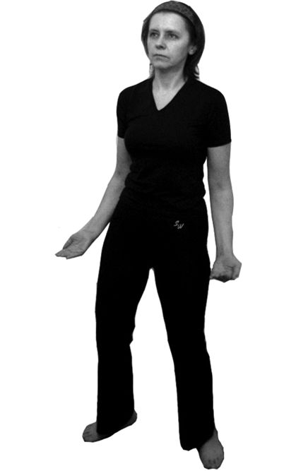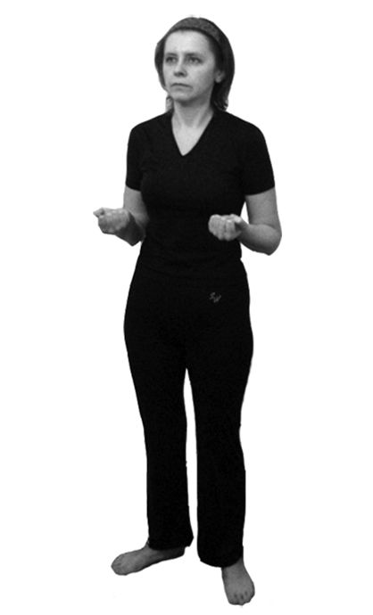 Исходное положение: стоя, ноги на ширине плеч. Спина прямая. Грудь немного втянуть. Руки опустить вдоль туловища. Взгляд направить прямо перед собой. Колени немного присогнуты (как в предыдущем упражнении).