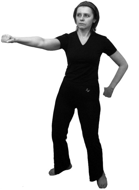3. На счет «три» левый кулак разворачивается вниз и с силой выполняет прямой удар до полного выпрямления руки. Верхняя часть корпуса остается неподвижной. Взгляд сосредоточен на кулаке. Движения выполняются на вдохе.