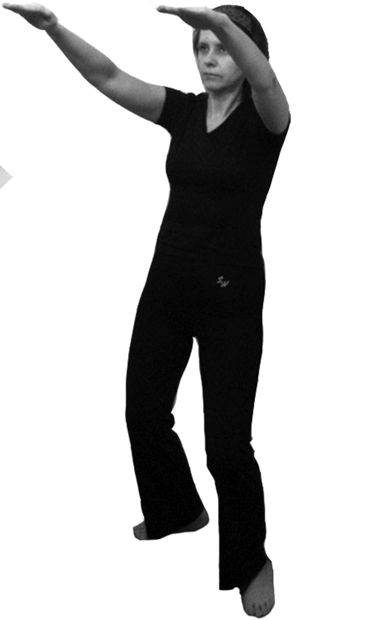 1. Поднимаем вверх левую ногу, при этом правой рукой от плеча имитируем удар по мячу (рис. 6.31). Движения выполняются на вдохе.