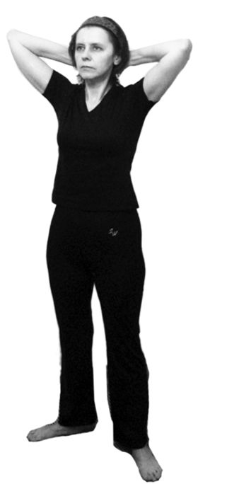 Исходное положение: стоя, ноги на ширине плеч. Спина прямая. Взгляд направлен вперед. Руки – на затылке, сцеплены в ладонях (рис. 6.40).