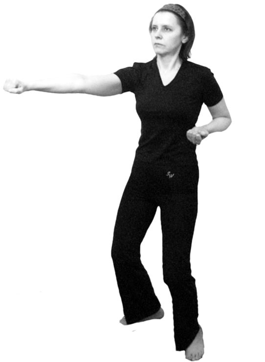 3. На счет «три» на вдохе выполняем «удар» с левой ноги.