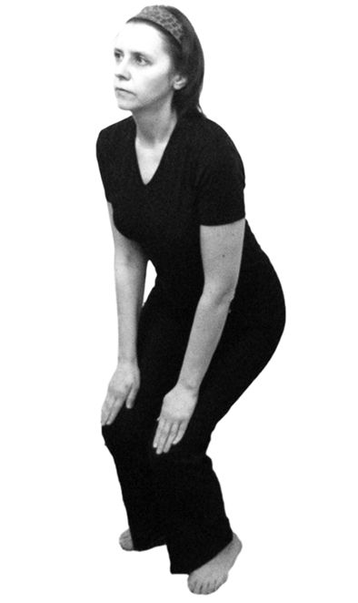 Исходное положение: стоя, ноги вместе – слегка присогнуты в коленях. Верхняя часть туловища наклоняется вперед в пояснице (а не в шее!). Руки лежат на присогнутых коленях (рис. 6.47).