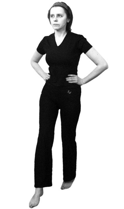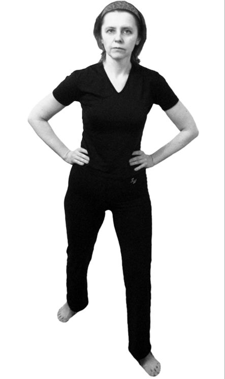 Исходное положение: стоя, ноги на ширине плеч. Спина прямая. Взгляд направлен вперед. Руки на поясе.