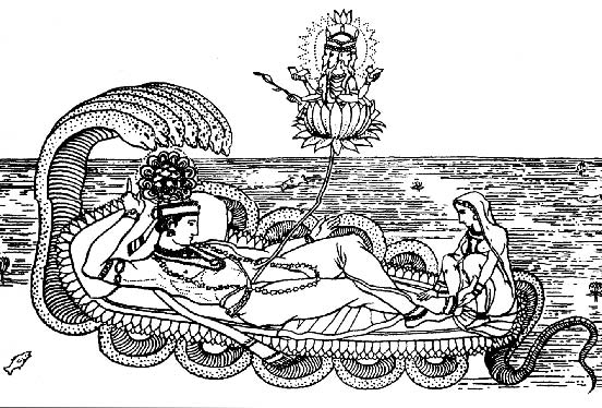 Вишну и Лакшми, наблюдающие за творением: Брахма вырастает из цветка лотоса, берущего начало из пупка Вишну