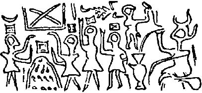 В храмах Шумера были распространены изображения лодочников, а также жертвоприношений, где рисунки земных жертвенников и участков небес, принимающих жертвоприношения, очень напоминают «решетку» и помещенный над ней Х-образный знак. При этом Щ-образный знак левее «решетки» сопоставим с жертвователями шумерских печатей, а «елочка» правее Х-образного знака – с принимающими жертву небесными божествами. Смысл жертвоприношения раскрывает плуг, изображенный у ног приносящих жертву. Он символизирует весеннюю пахоту, сев, а жертвоприношение сопровождается обращенной к небу молитвой о ниспослании дождей и тепла.
