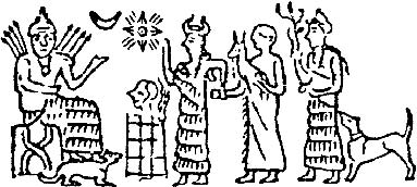 Этот миф проиллюстрирован на одной из табличек Шумеро-Аккадского царства. Слева мы видим сидящего на троне мужчину с четырьмя стрелами над каждым плечом. Это некое божество с подобием брасмана – магического орудия индоиранцев, призванного воздействовать на небеса. Божественный ранг сидящего на троне подчеркнут также серпом Луны и «звездой». Она составлена из круга с точкой (знак Солнца), а также из 4 х 3 концов и такого же количества лучей, символизирующих времена и месяцы года. Наряду с атрибутами небесной власти подчеркнуто владычество бога и над потусторонним миром: ему прислуживают два пса, перед ним стоит жертвенник с человеческой головой. Эти атрибуты, как и брасман, становятся характерными затем и для индоиранской культуры: пара псов прислуживает Яме, владыке загробного царства, а отсечение головы у жертвенного титана Пуруши символизирует «сотворение» неба.