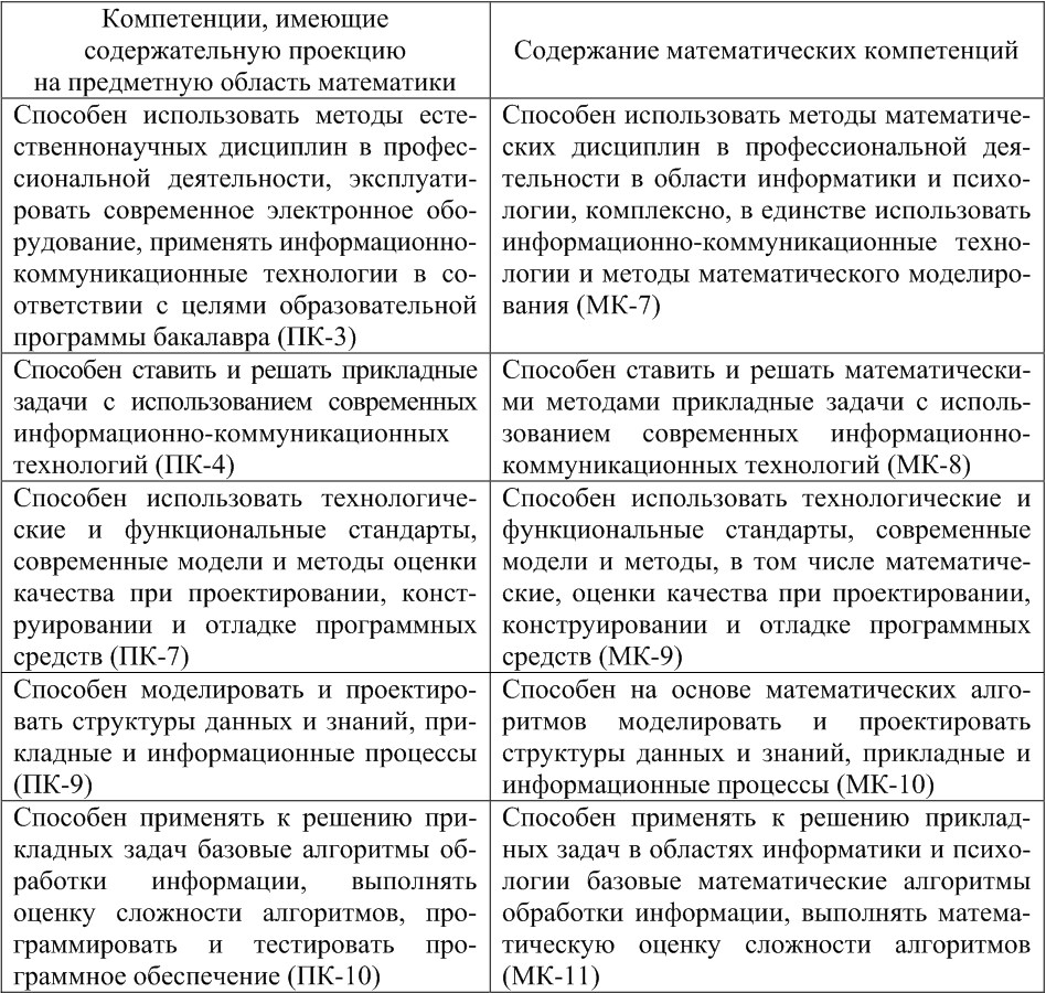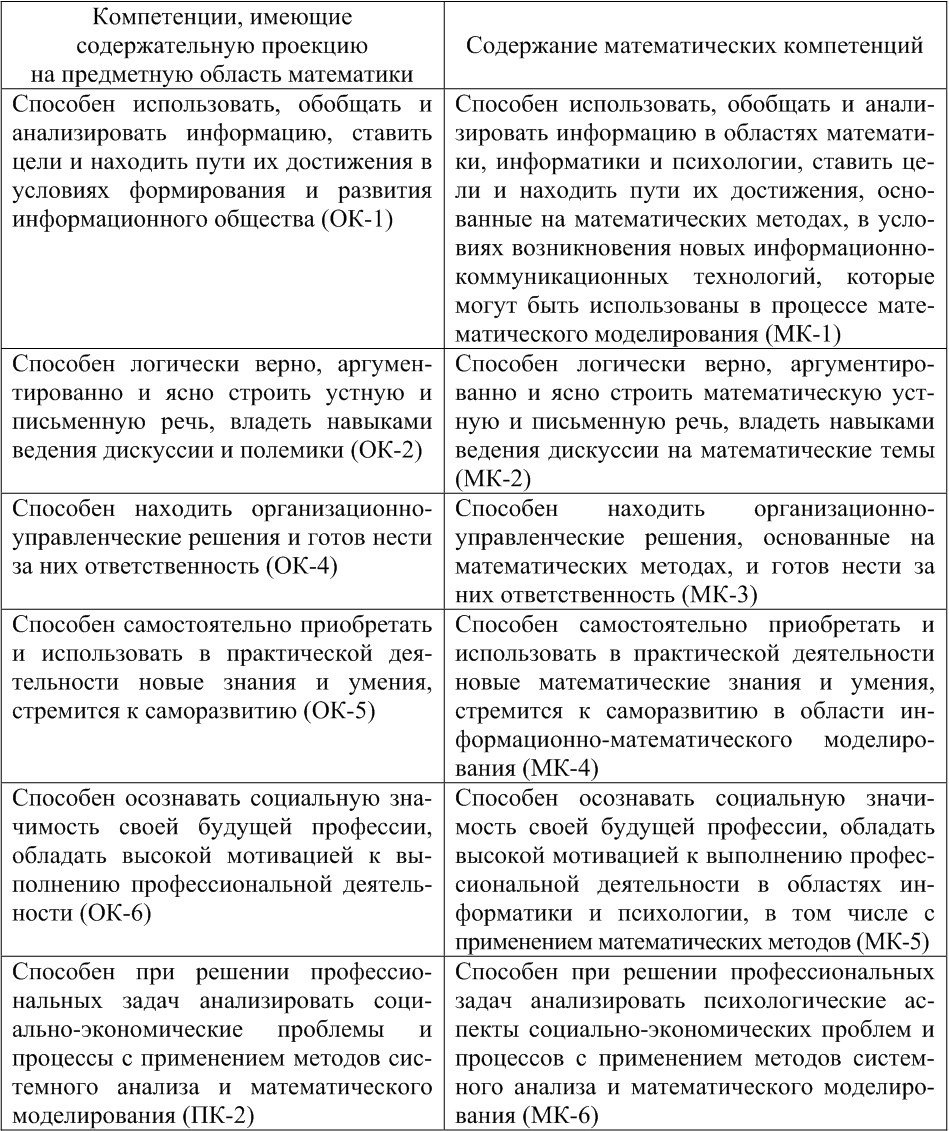 Определим проекции этих компетенций на предметную область математики применительно к профилю «Психология» следующим образом. Проецируя, например, компетенцию студента ОК-2, получим математическую компетенцию «способен логически верно, аргументированно и ясно строить математическую устную и письменную речь, владеть навыками ведения дискуссии на математические темы». Проецируя компетенцию ПК-3, получим математическую компетенцию «способен использовать методы математических дисциплин в профессиональной деятельности в области информатики и психологии, комплексно, в единстве использовать информационно-коммуникационные технологии и методы математического моделирования».