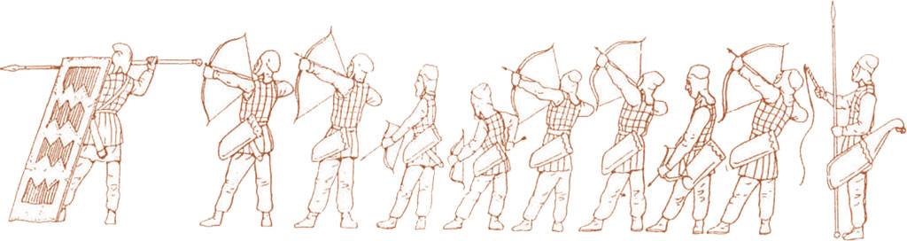 Против персов выступило объединенное войско афинян и платейцев. Его основу составляли гоплиты – тяжеловооруженные пешие воины, которые сражались с помощью длинных метательных копий. Их тела защищали медные шлемы, латы и большие щиты. В бой гоплиты шли специальным боевым строем – фалангой, которая представляла собой длинные, тесно сомкнутые ряды воинов, прикрывающихся щитами и ощетинившихся копьями.