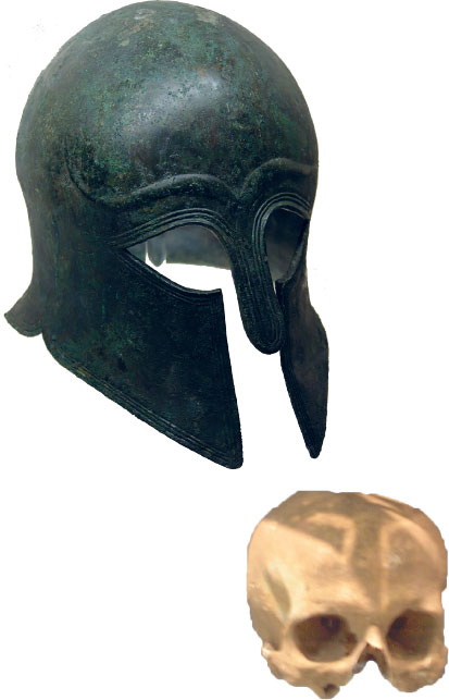 Череп и древнегреческий шлем коринфского типа, обнаруженные на месте Марафонской битвы