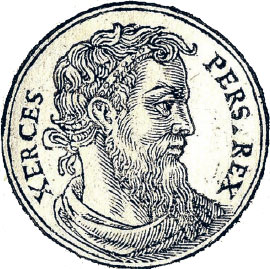 Ксеркс I. Изображение царя сохранилось в книге Гильома Рули «Беглый обзор монет…». 1553 год