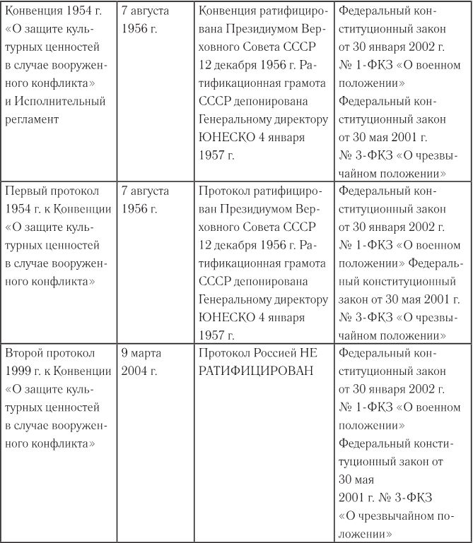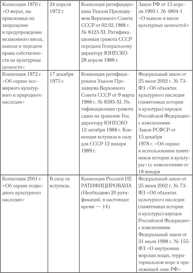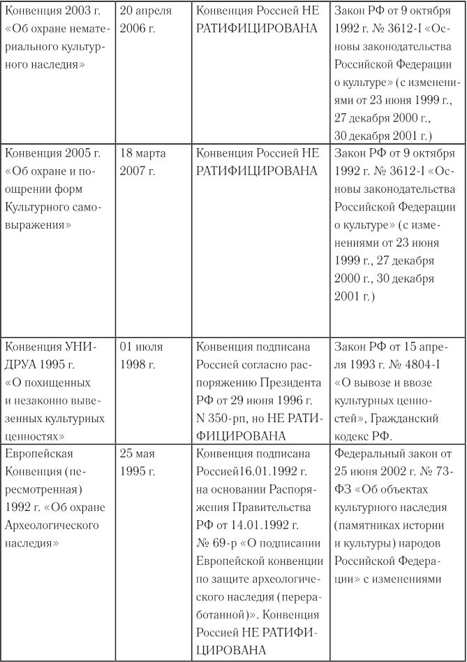 Российская Федерация ратифицировала некоторые европейские конвенции. В таблице 1 приведены документы, ставшие основной частью российского законодательства об охране историко-культурного наследия, а именно [9]: