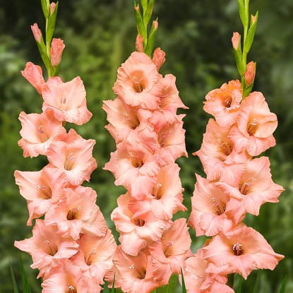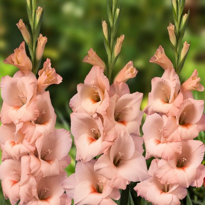 Джорджия Пич – гладиолус из Нидерландов необычайной кремово-персиковой расцветки. Она не розовая и не бежевая, не лососевая и не персиковая. Ее хочется назвать пыльно или дымчато-розовой, необычайно нежной и равномерной. Легкая гофра по краям лепестков делает цветки удивительно изящными и буквально порхающими вокруг цветоноса.