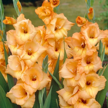 Цветение гладиолуса Бресциа действительно впечатляет: огромные цветы плотно прижимаются друг к другу, словно пытаясь отвоевать себе побольше места на длинном и упругом цветоносе.