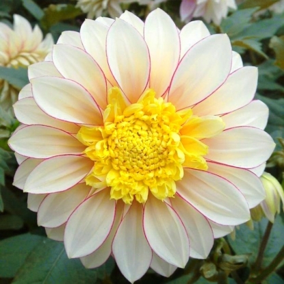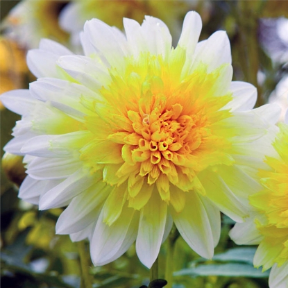 Нежные соцветия этого сорта георгин похожи издали на ромашки: желтые махровые серединки и длинные белые лепестки по краям.
