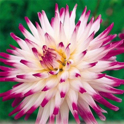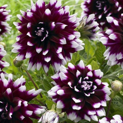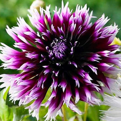 Эффектные роскошные цветы георгины Алауна Клер Обскур – это море бурных эмоций. Огромные цветы фиолетового цвета с белоснежными кончиками. Многочисленные лепестки собраны в шикарные соцветия, аромат приятный и насыщенный.