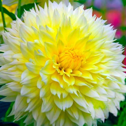 Первая волна цветения представлена туго набитыми бутонами, заостренные и изрезанные кончики которых выкрашены с сливочно-желтый оттенок, тогда как в середине покоится солнечный желтый. Георгина Myama Fubuki хорошо реагирует на постоянную обрезку, не болеет и не увядает раньше времени. Вынослива.