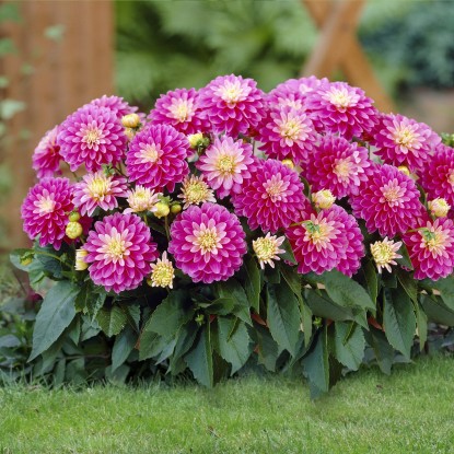 Он представляет декоративную серию «Gallery», выведенную специально для контейнерного выращивания и декорирования переднего плана клумб. Сорт формирует невысокие, но очень пышные кустики высотой не более 45 см, которые уже в начале лета покрываются огромным количеством соцветий 10 см в диаметре. В случае с георгиной Рембрандт – это ярко-розовые соцветия с четко очерченным желтым центром. Такая контрастная расцветка не останется без внимания, даже если сорту не повезет оказаться на его законном переднем плане.